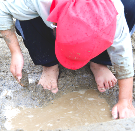 外でもはだし、紙おむつを使わない保育、泥んこ遊び、自然と触れ合うことを重視しています。