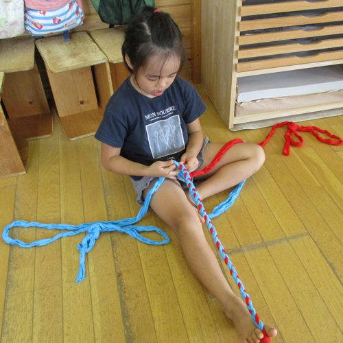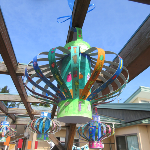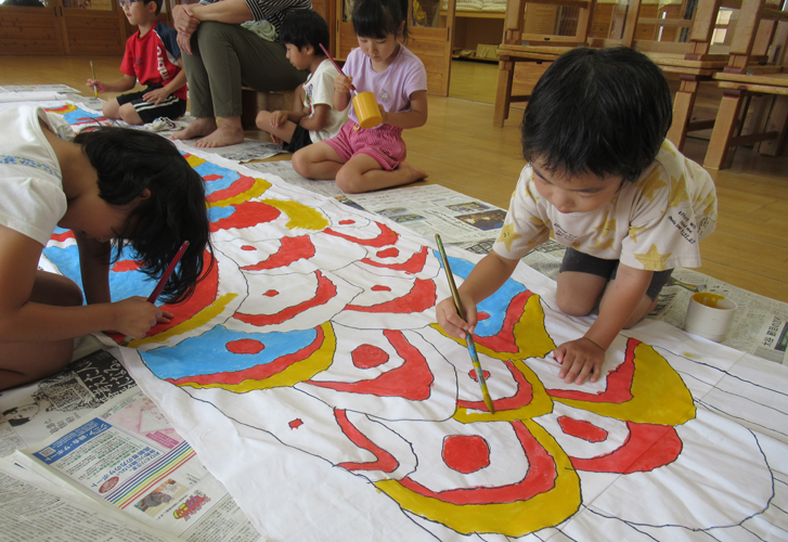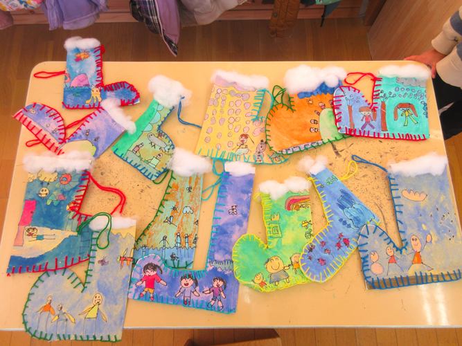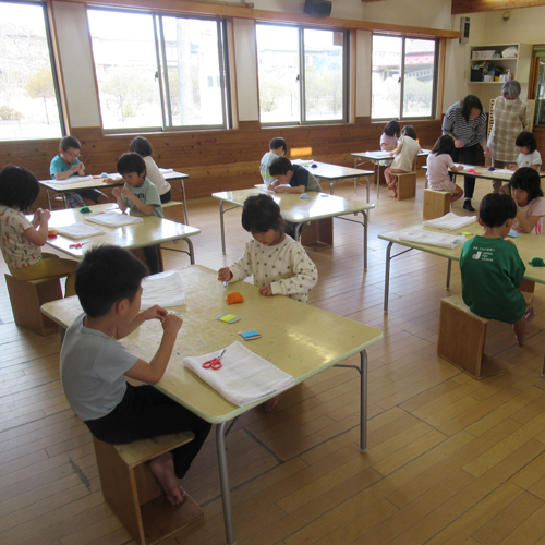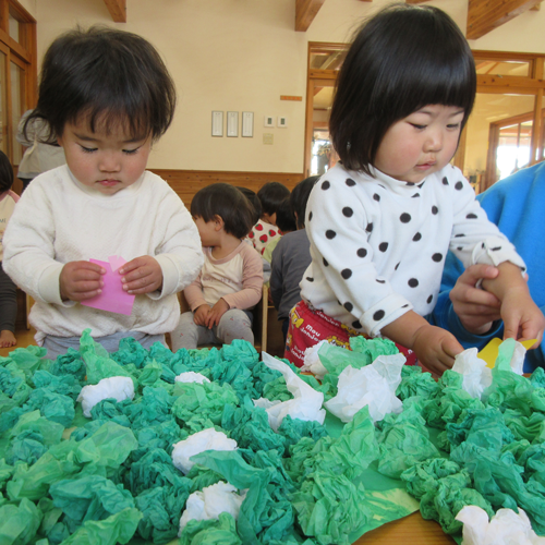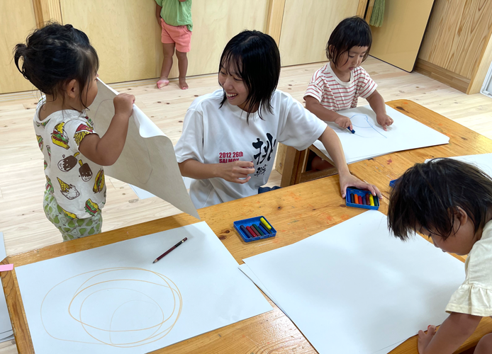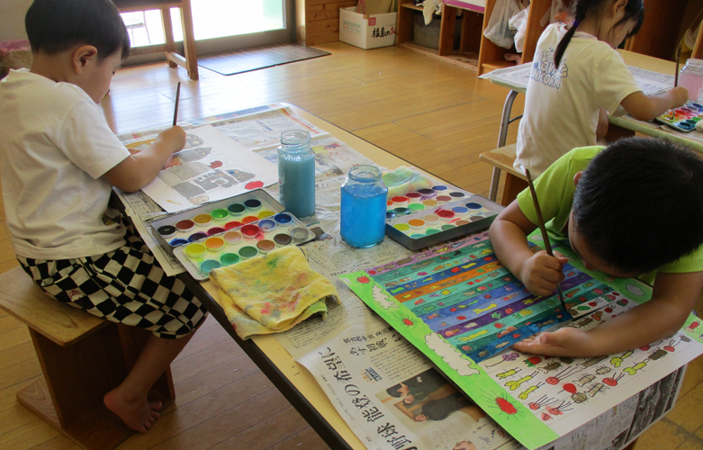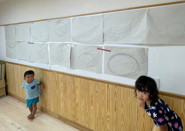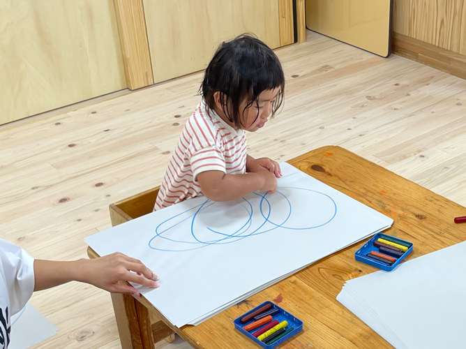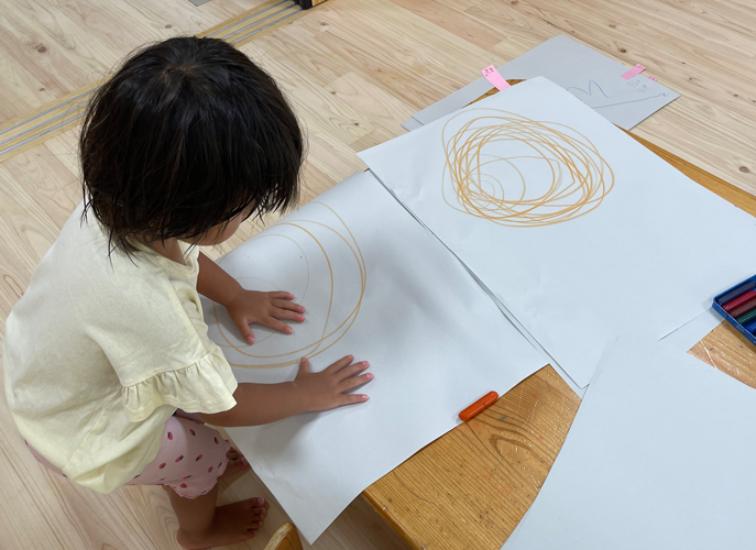 絵はまだ文字を持たない乳幼児の心の表現です。また、保育を見直す手段でもあります。 特注の紙を使って、いつでも好きな時に絵を描くことができる環境を整えて、気持ちを込めた道筋のある表現ができる力とその充実を図ります。