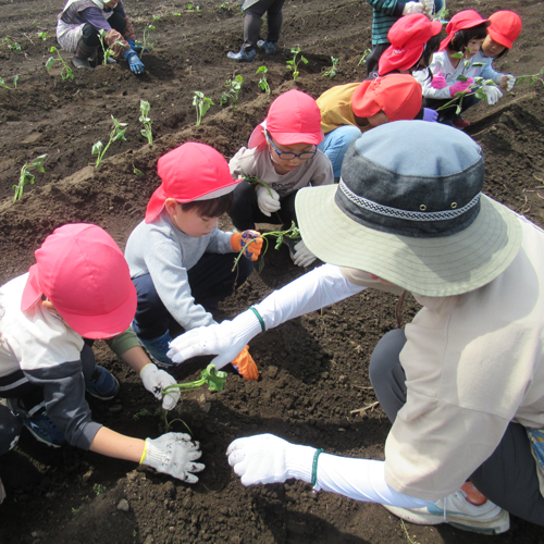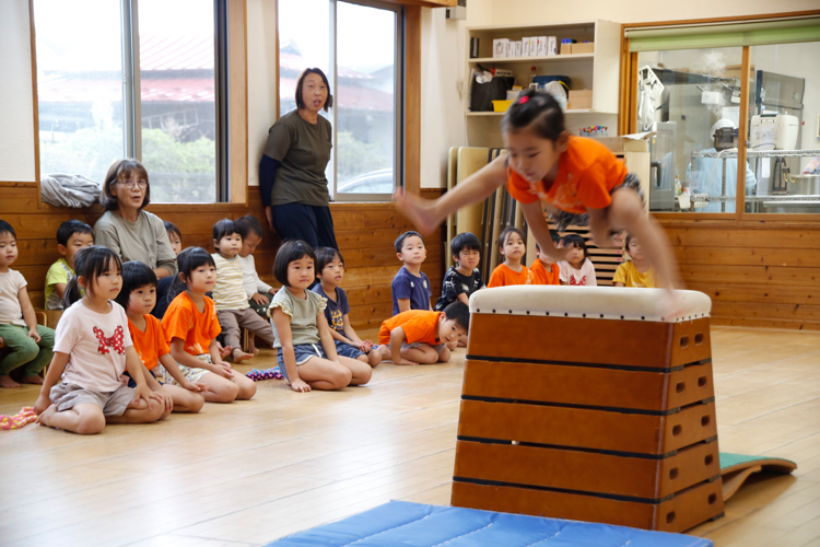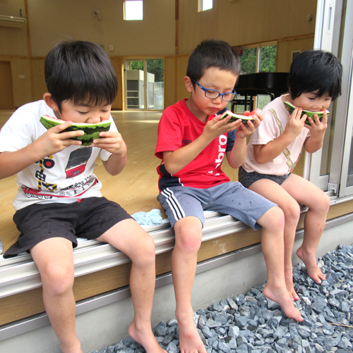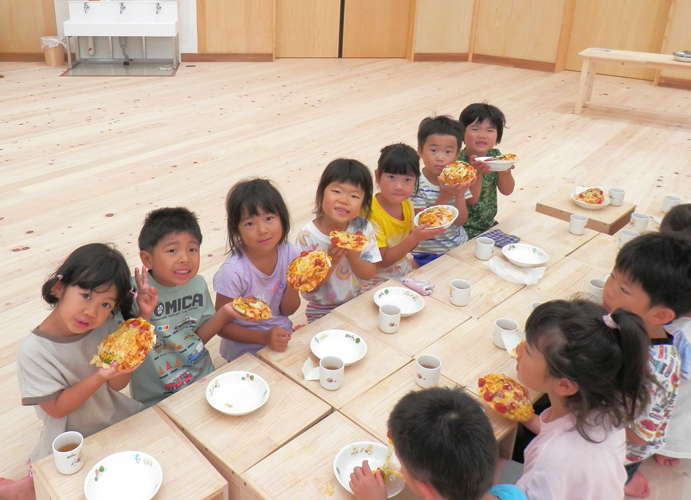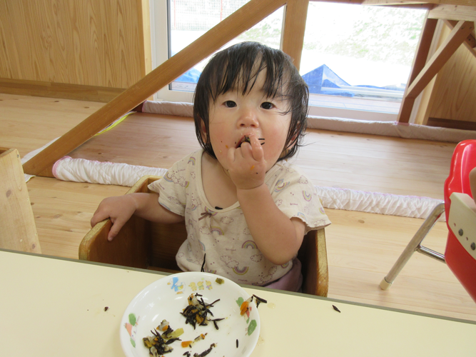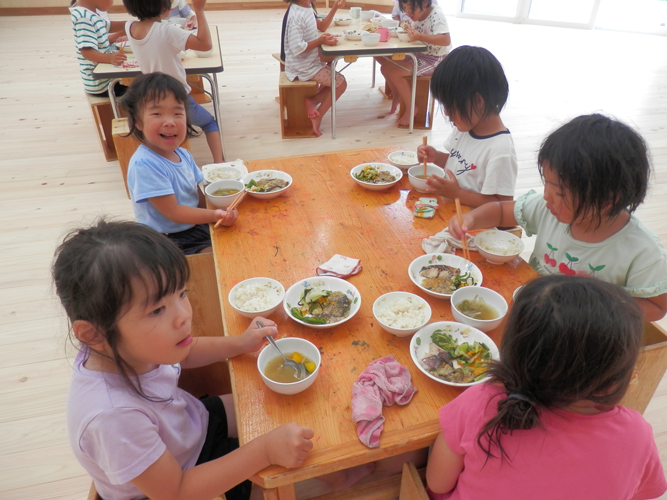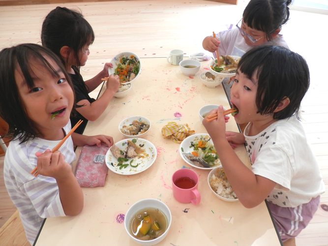 食材を選び、1汁3菜の野菜中心の食事で体の土台を作ります。 各年齢とも完全給食です。食材を吟味し、米は完全無農薬米の認定農家から購入しています。 添加物の少ない、地場産野菜を使っています。白砂糖は使いません。 おやつも手作りで、食事の一環として考えます。また、嚙むことを大切に考え、スルメや煮干しが出ることもあります。 大事なことは、自分で食べようとすること、食べる意欲は生きる意欲です。