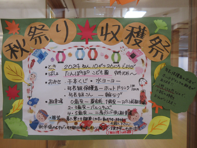 ・秋祭り(収穫祭) ・総合避難訓練 ・園内お泊まり保育(年中)