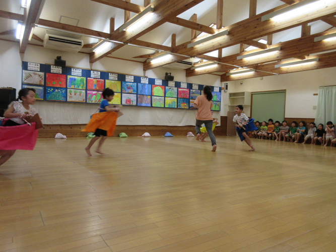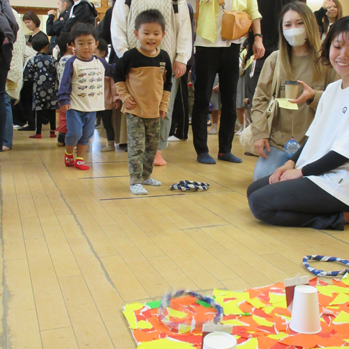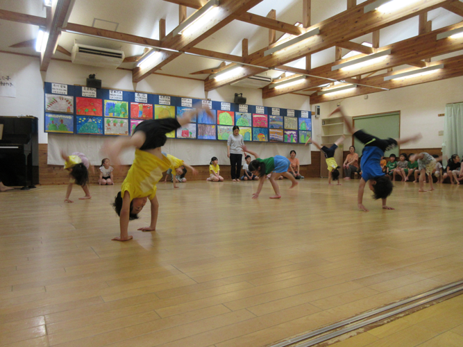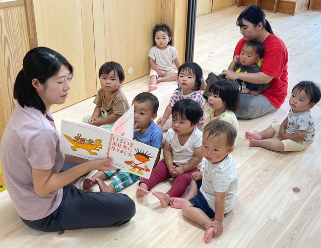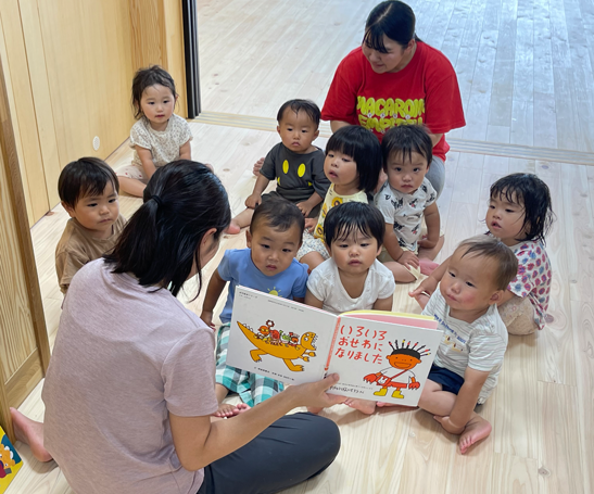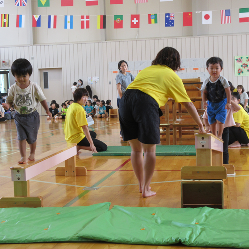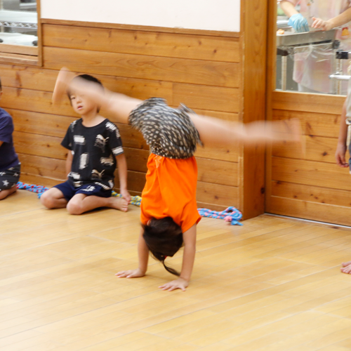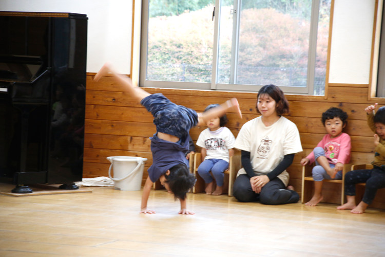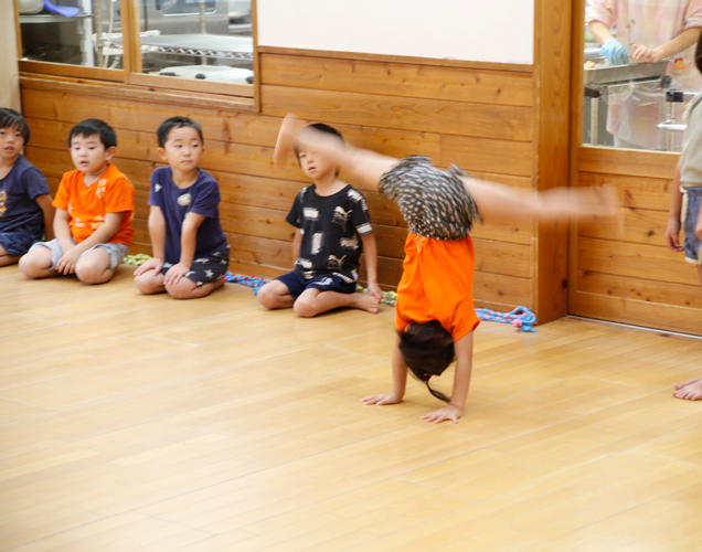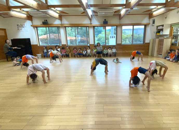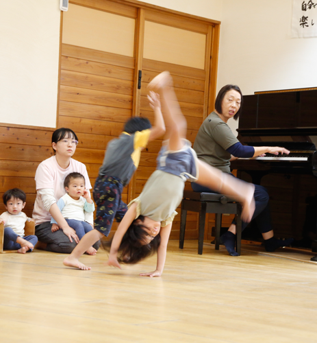 ピアノの音が聞こえてくると、0才児の子どもたちもホールに集まってきます。 CDではなく、同じリズムでも、ピアノを弾くことで、年齢や発達の状態に合わせたテンポや長さを変えることができます。 ピアノに合わせて走ったり、跳んだり、転がったり、スキップしたり、毎日のリズム遊びが子どもたちは大好きです。