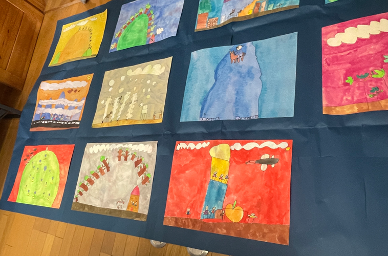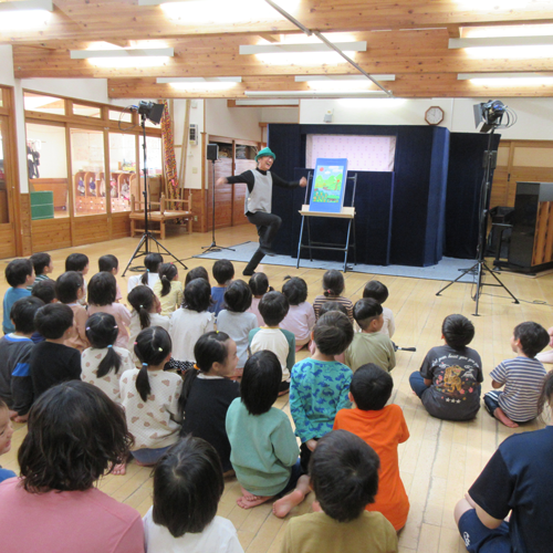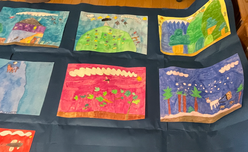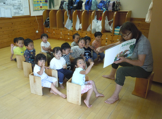 良質の絵本と紙芝居、子どもたちは食い入るようにお話を聞き、年長児は1時間以上のお話を集中して聞くことができる体になっています。 その後、読んでもらった絵本を理解し、水彩画に表します。 食べることと同じように絵を描き、絵本を読みます。