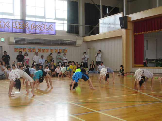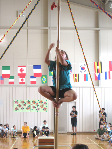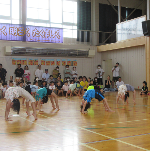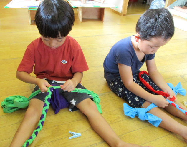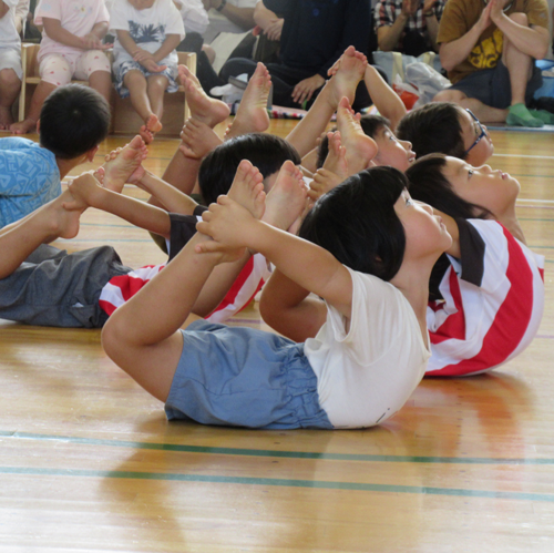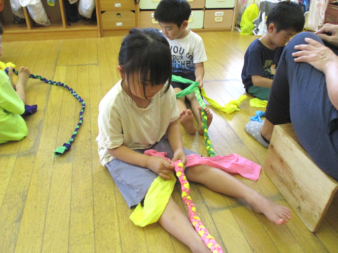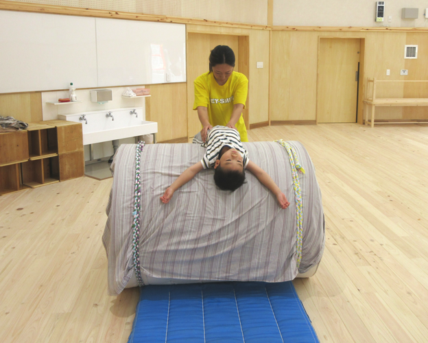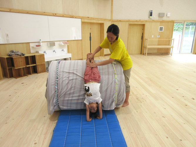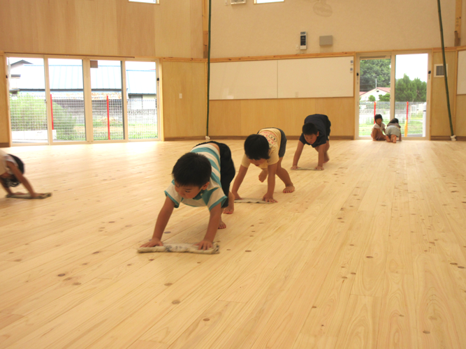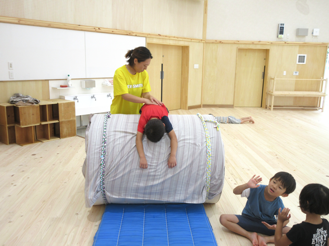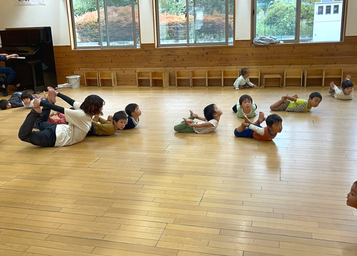 ロールマット上で、マッサージを行います。全身の緊張をほぐすとともに身体の状態を確認します。 その後、雑巾がけやお掃除当番を行って、一日が始まります。